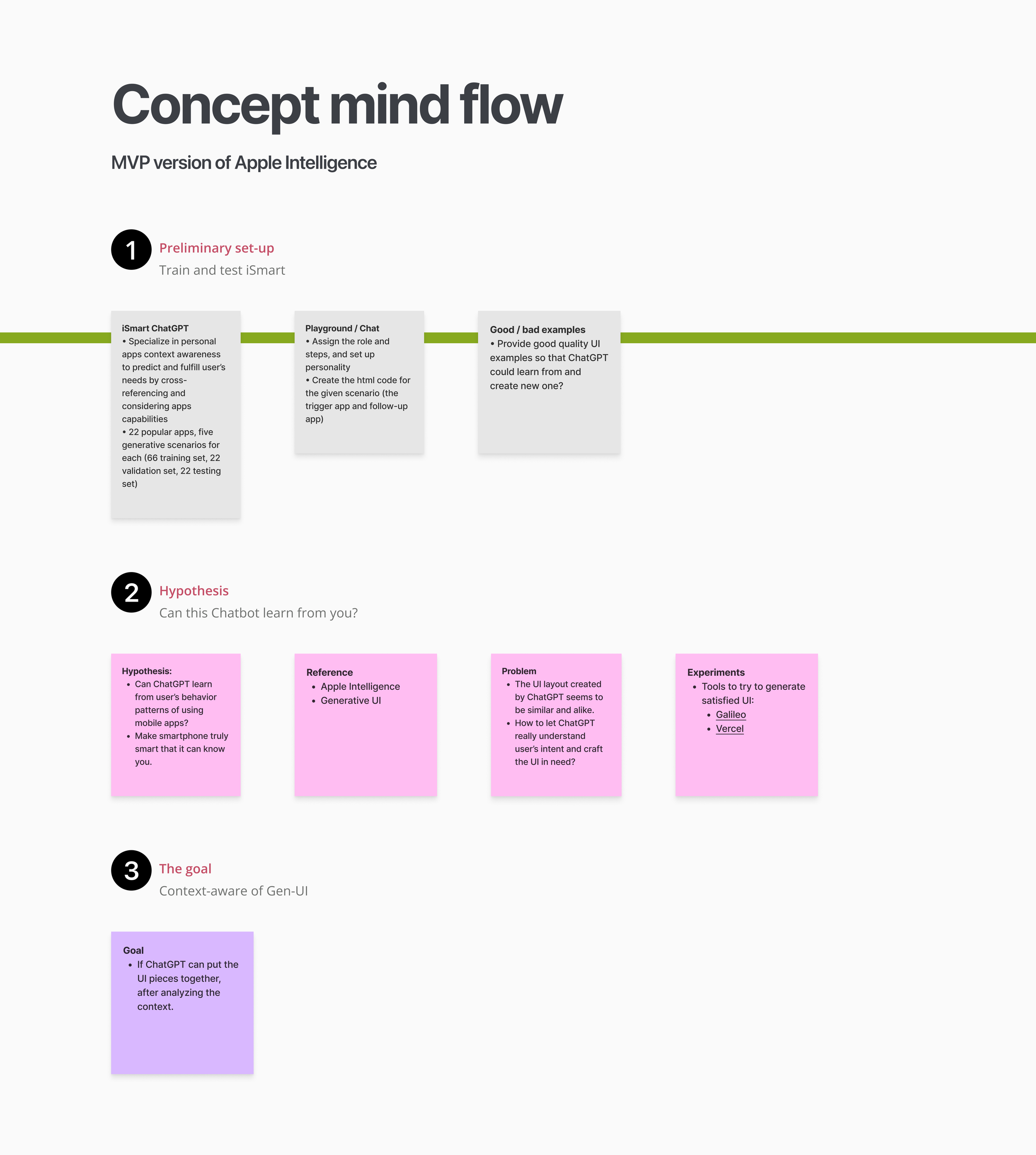 When ChatGPT became available during this project, the objective was to develop an intelligent chatbot similar to Apple's Intelligence initiative. The chatbot would provide information tailored to my needs based on prior behavioral patterns and history. Additionally, it would generate a user interface that anticipates and addresses my upcoming requirements—essentially serving as a minimum viable product (MVP) version of Apple Intelligence.