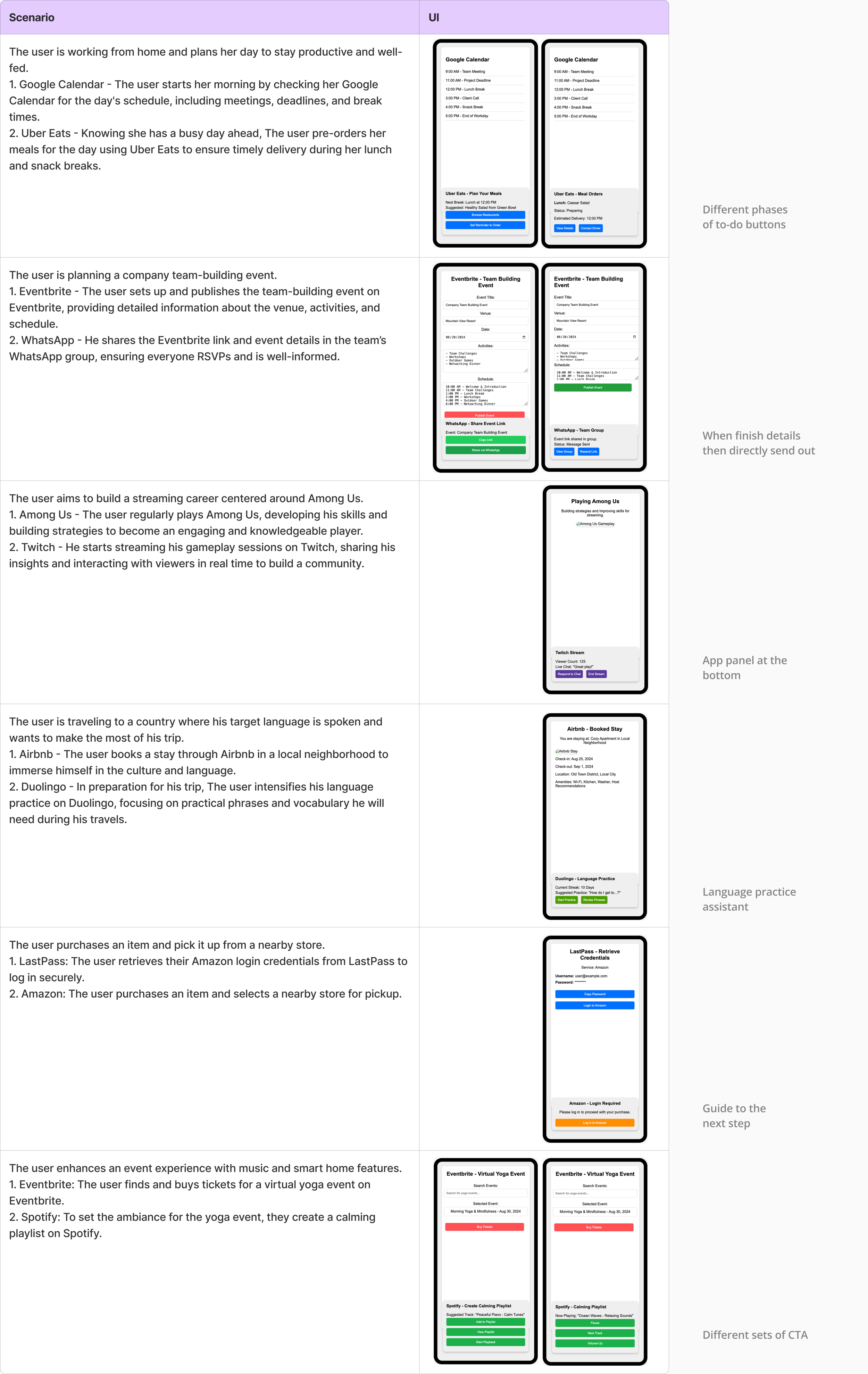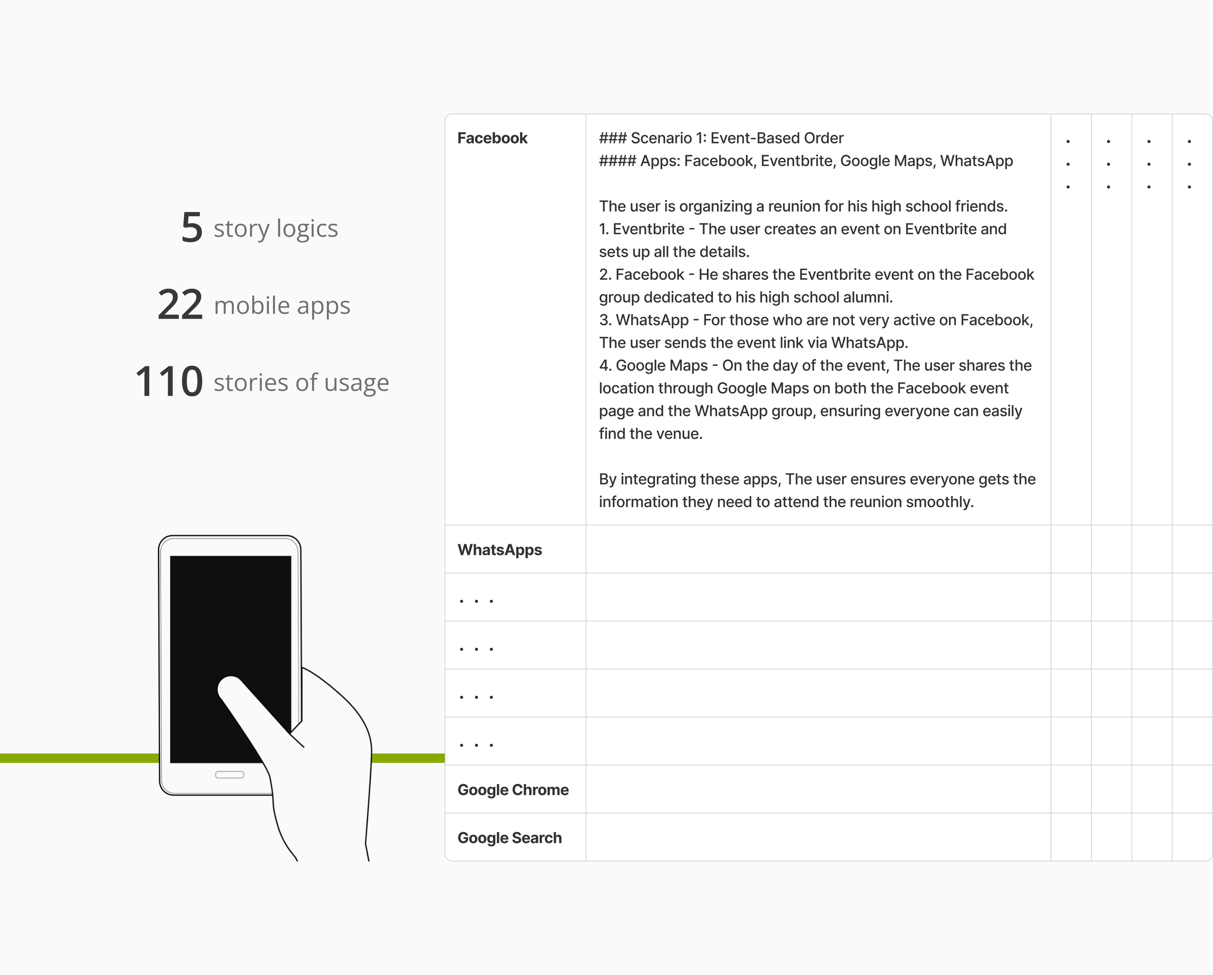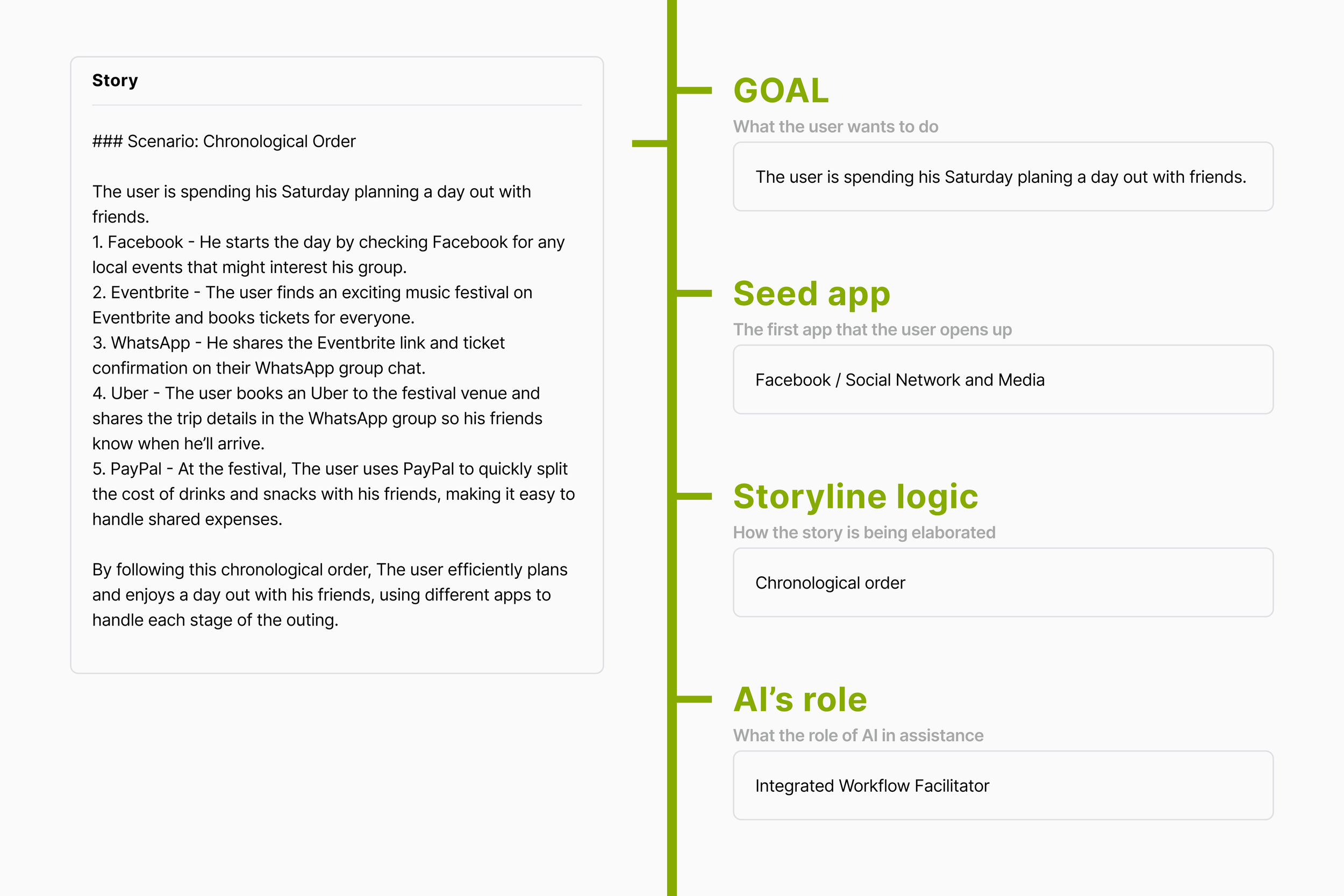 A story is essentially a sequence of actions involving applications, without any underlying analysis. For instance, a person plans a day out with friends on Saturday to attend a festival, purchase drinks, and potentially have dinner together. Without additional context, this is simply a straightforward account of the person's activities. To enable smartphone AI to gain deeper insights into user behavior and identify meaningful data points for future use, I incorporate an additional analytical layer in each story: the user's goal and the AI's role.