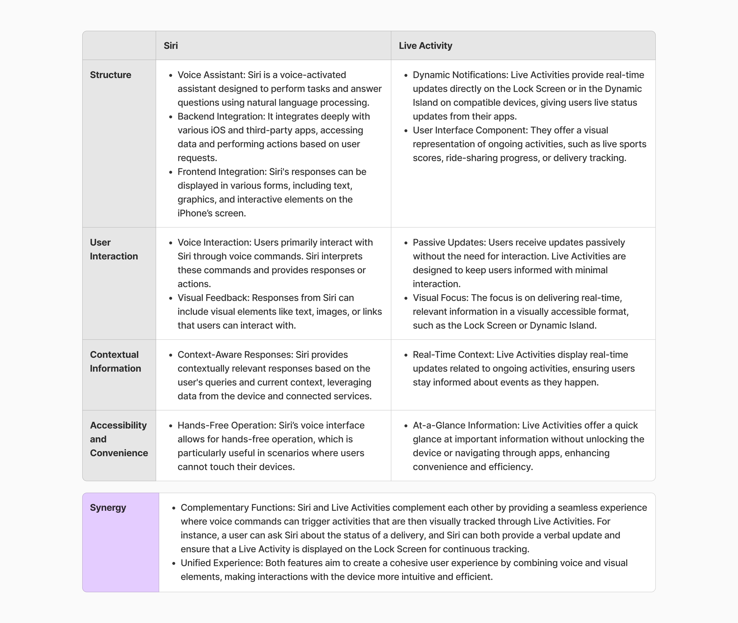 Before we move on, let’s see these how two design patterns: Siri and Live Activity, in the iOS system behave, which are acting like a smart assistant for our Gen-UI design candidate: