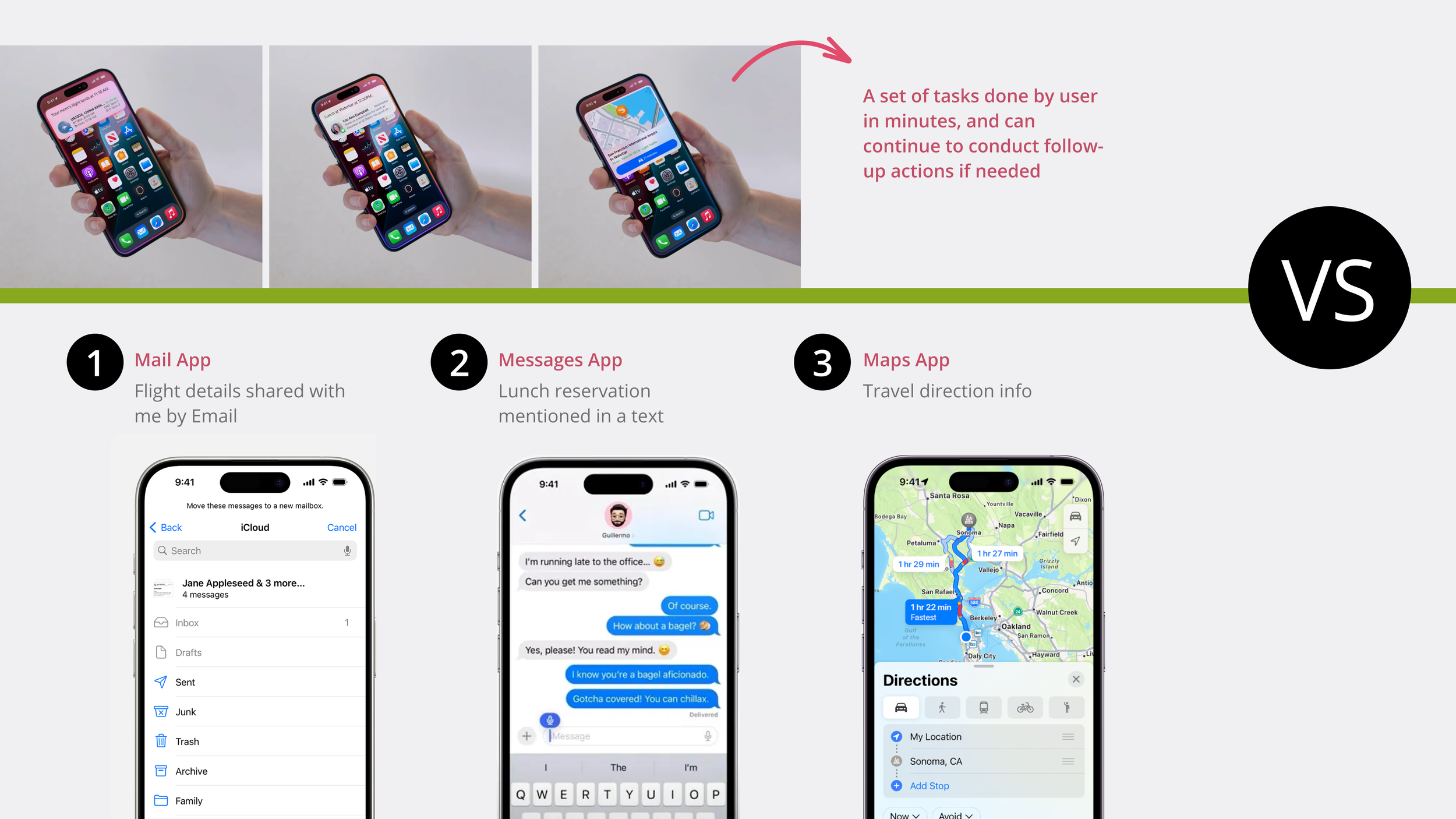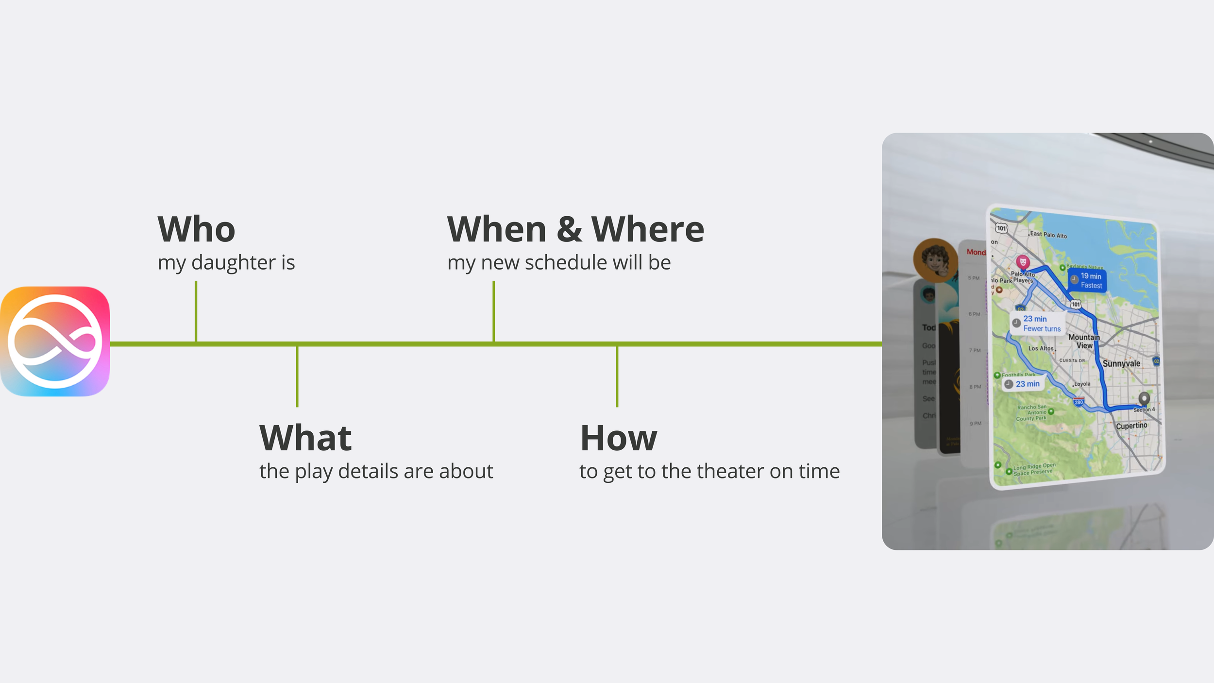 However, the next demo does catch my eye. The speaker plans to pick her mom from the airport, so she asks the time of her mom’s flight landing will be. If the prompt stops here, it will be no different compared with other cases above. But then the speaker asks “what’s our lunch plan?”, which slightly indicates a series of events that will be very likely taking place one after another. And by that, she keeps asking how long will it take us to get there from the airport, so the intention behind the specific time and location inquery got to be well-fed into the AI system to come up with a satisfied suggestion in response. No need to jump from Mail to Messages to Maps for user. She can even get an Uber to pick her mom if that’s what she usually does.
